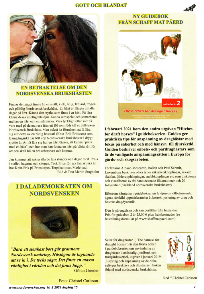 En juin 2021, la deuxième édition“The hitches for draught horses” de notre série de guides pratiques fut présentée dans la Tidningen Nordsvenska Hästen (No 2 2021), le journal du syndicat du cheval Suédois du Nord.